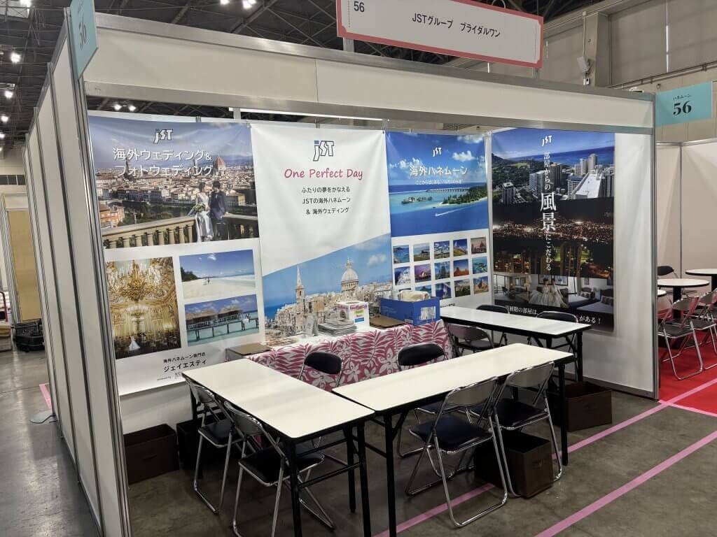旅行事業など幅広く展開されている(株)ジェイエスティ様より、展示会用のブース装飾幕をご依頼いただきました。壁面に幕を設置することで、社名やサービス内容がひと目で伝わる視認性の高いデザインを実現。シンプルな構成ながらも、統一感のある色使いが企業イメージをしっかりと印象づけます。