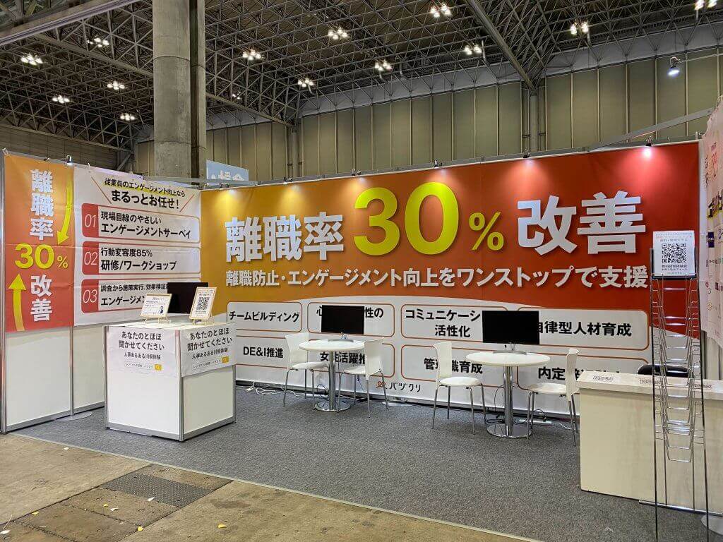人材育成や組織開発を支援するバヅクリ株式会社様より、展示会ブース用の幕製作をご依頼いただきました。ブース左右に設置された幕は、オレンジ系カラーをグラデーションで表現したやさしく親しみやすいデザインが特徴です。明るく柔らかな雰囲気が来場者の目を引き、自然と立ち寄りやすい空間を演出しています。