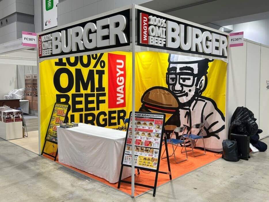 滋賀県の特産品「近江牛」を取り扱う(株)総合近江牛商社様より、展示会ブース用の幕をご依頼いただきました。会場でひと際目を引く鮮やかな黄色の背景に、英語テキストとイラストを組み合わせたデザインが印象的。ブランドの世界観をしっかりと伝えながらも、大胆な配色で来場者の足を止めるブースです。
