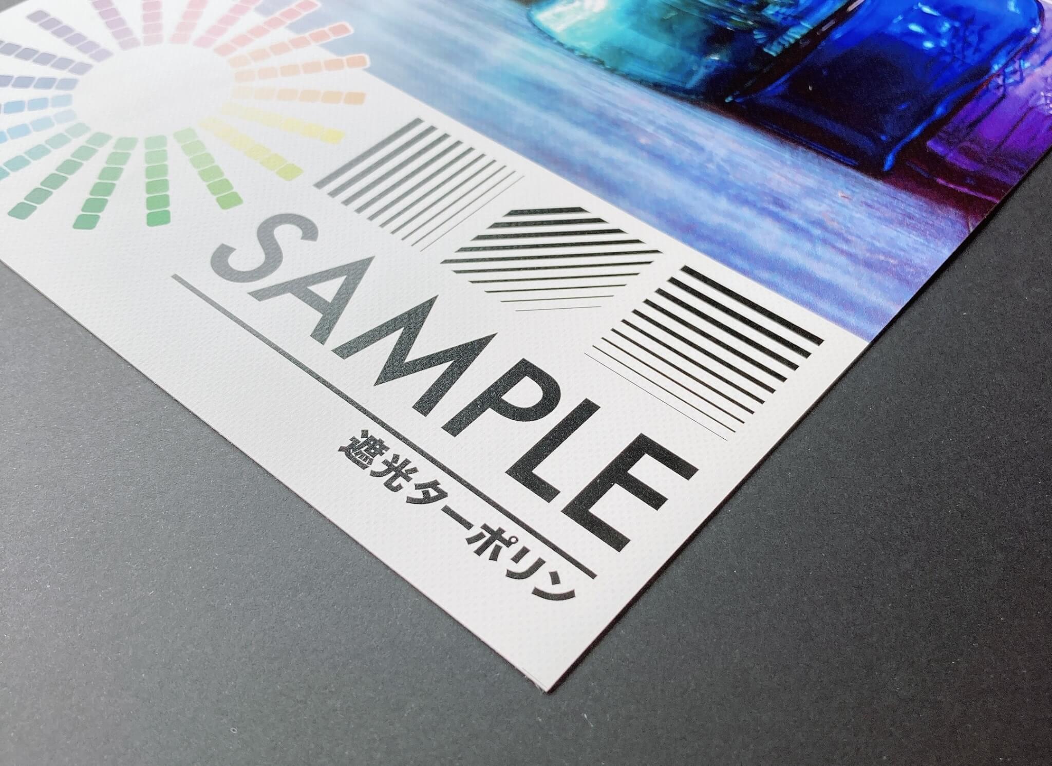 遮光ターポリンは、生地の内部に遮光層が入っており、背面からの光を通しにくい素材です。会場の位置によって背後に照明や外光がある場合でも、印刷面の色や文字が影響を受けにくくなります。
