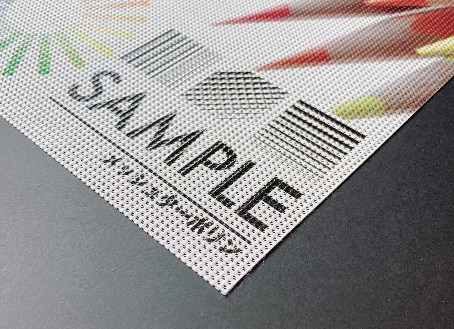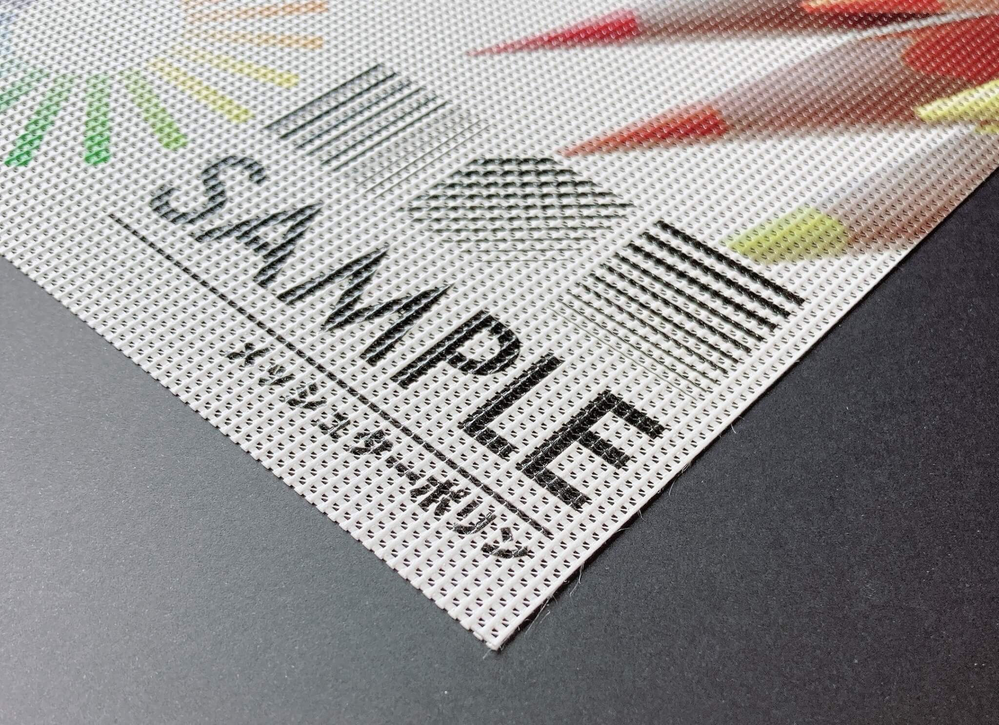 風の抜ける細かな穴が空いた素材で、強風対策に最適です。通風性が高いため、フェンスや歩道橋など高所での掲出でも安全性を確保できます。軽量で取り扱いやすく、短期イベントや季節ごとの掲出にもおすすめです。透け感があるため、デザイン時には背景色とのコントラストを意識しましょう。また、光の透過を抑える仕様の遮光メッシュターポリンもあり、強い日差しの下でもデザインをはっきり見せたい場合に適しています。