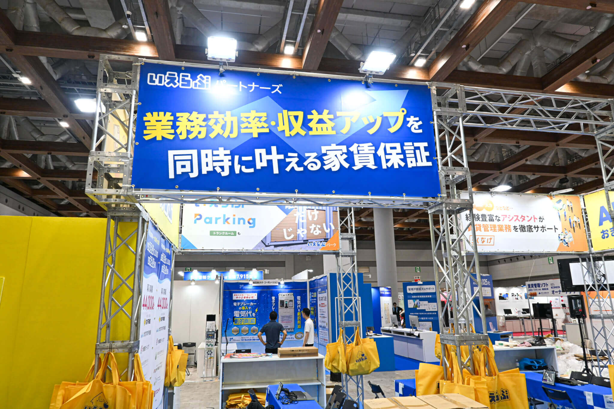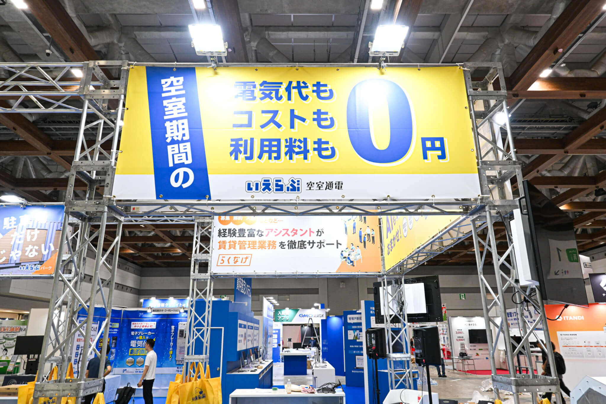(株)いえらぶGROUP様より、展示会ブースのトラスに設置するターポリン幕をご依頼いただきました。ブースの高さを活かしたダイナミックな装飾で、遠目からでもしっかりと訴求内容が伝わる印象的なブースに仕上がっています。