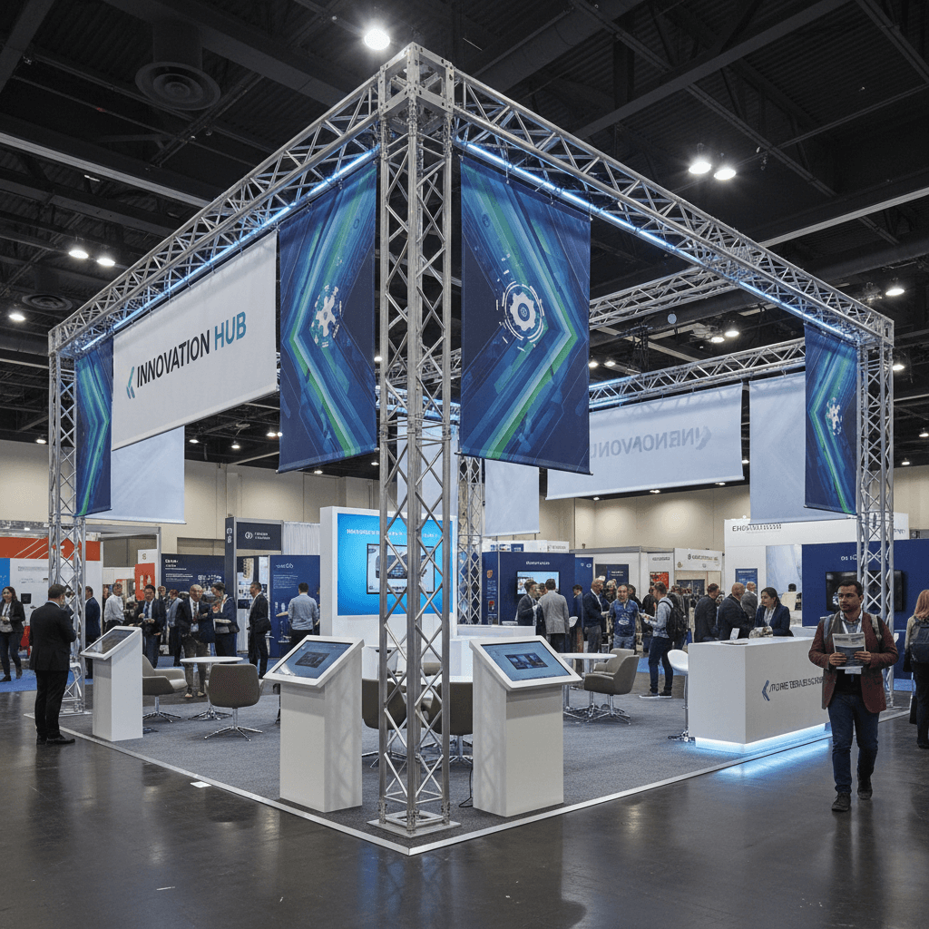 トラスは、展示会ブースに高さ・視認性・拡張性をもたらす非常に優れた構造体です。照明やサインを支えるだけでなく、空間を立体的に演出できるため、限られたスペースでも存在感のあるブースを実現できます。