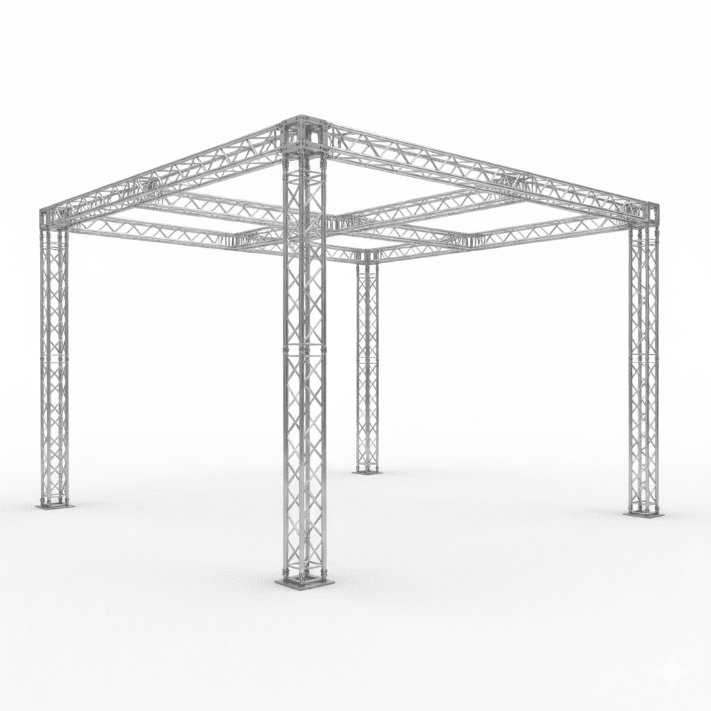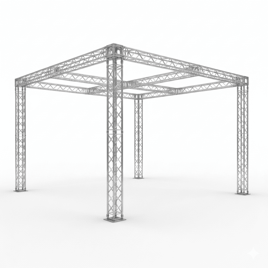 トラスとは、複数のパイプやフレームを三角形の組み合わせで構成した、軽量かつ強度に優れた骨組み構造のことです。展示会に限らず、舞台、イベント、建築現場、スポーツ施設など幅広い分野で利用されています。